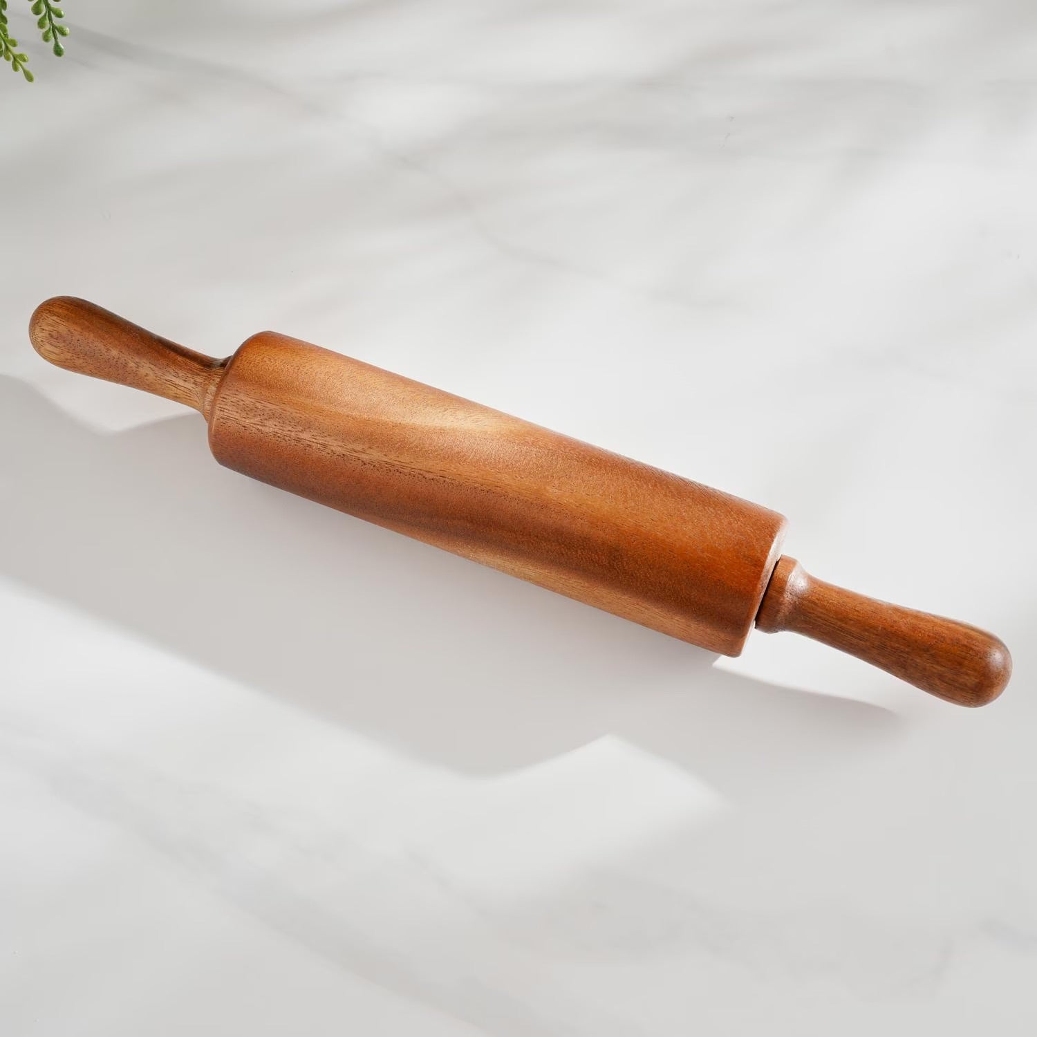 Our Rolling Pin is crafted from natural acacia wood, offering durability and a smooth rolling experience for everyday baking. Designed with ergonomic grip handles, it provides comfortable control while rolling dough for pastries, cookies, or bread.