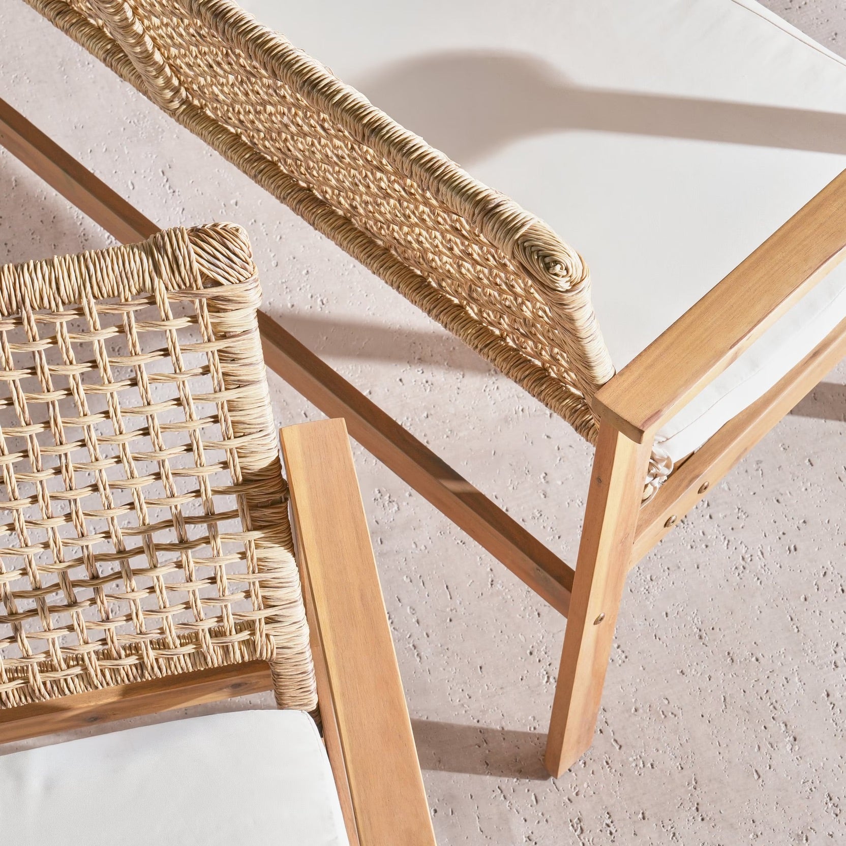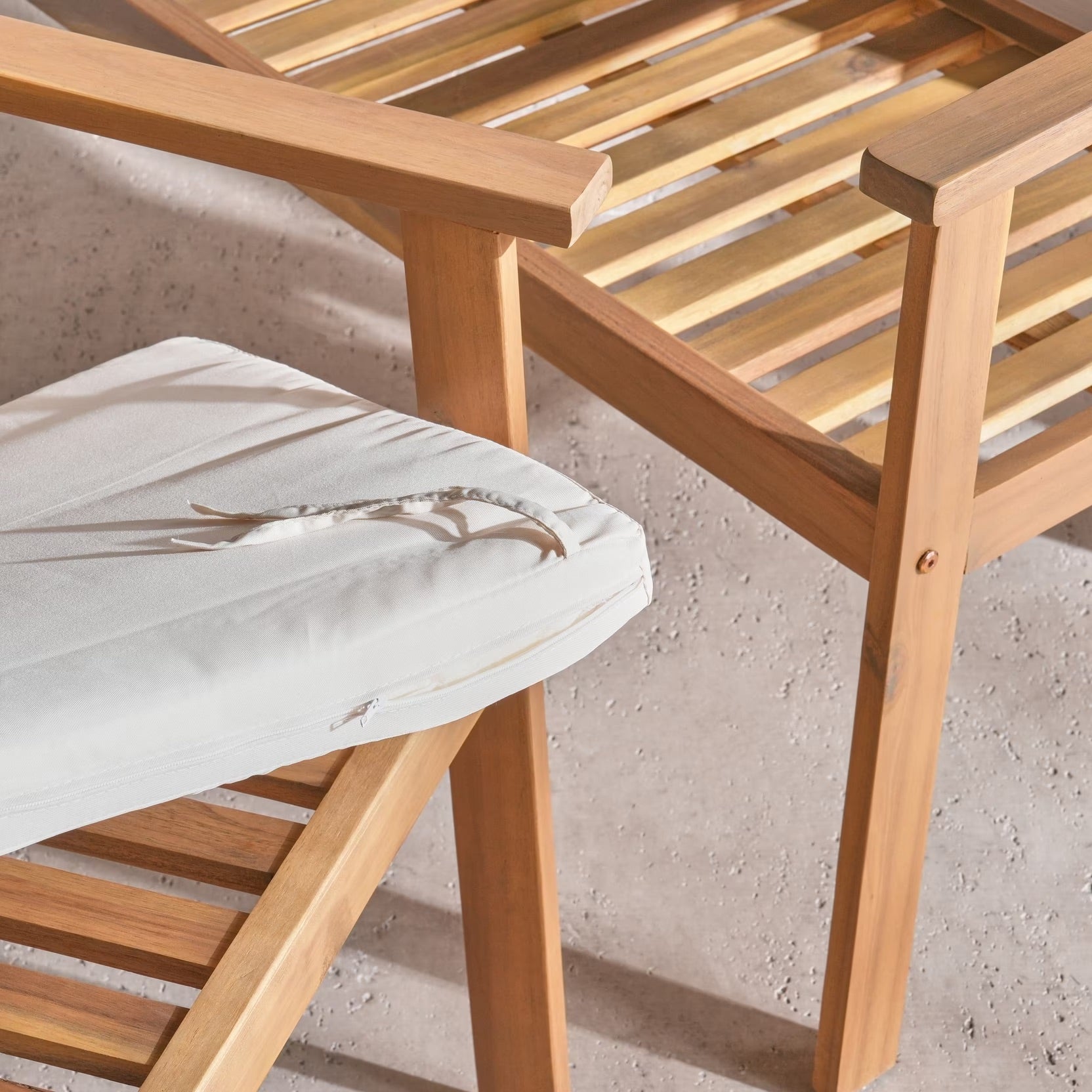 Designed with sturdy wooden frames and padded fabric seats in a clean white finish, it offers versatile use for both indoor and outdoor spaces. The weather-friendly materials ensure durability, while the track arm design adds a contemporary touch.